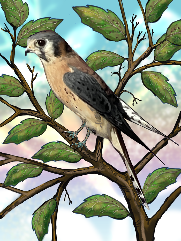 Acrylic/Ink on stretched canvas. Gallery Wrap (Unframed) 30" wide x 40" tall $600.00 12" wide x 16" tall $195.00 Custom Framing Options Available. [ BUY ] The Kestrel is a small, agile bird of prey belonging to the falcon family (Falconidae). These birds are known for their distinctive hovering flight, sharp eyesight, and rapid wing beats. Kestrels are found worldwide in a variety of habitats, including open fields, grasslands, farmlands, and urban areas. One of the most well-known species is the Common Kestrel (Falco tinnunculus), found across Europe, Asia, and Africa. Another notable species is the American Kestrel (Falco sparverius), the smallest and most colorful falcon in North America. Kestrels are characterized by their slender bodies, pointed wings, and long tails. They typically have brown or rufous plumage with black markings, while males and females often exhibit slight differences in coloration, with males having more vibrant hues. These falcons are skilled hunters, primarily preying on small mammals, insects, and birds. They use a unique hunting technique called "hovering," where they stay nearly motionless in the air while scanning the ground for prey. Once spotted, they swoop down swiftly to catch their target with sharp talons. Kestrels are also known for their adaptability and can thrive in both natural and human-modified landscapes. They often nest in tree hollows, cliffs, or even man-made structures like buildings and nest boxes. Due to their impressive hunting skills and striking appearance, kestrels have long fascinated birdwatchers and researchers alike. While some species remain common, habitat loss and environmental changes pose threats to their populations in certain regions.