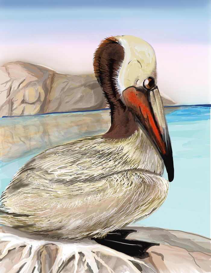Acrylic/Ink on stretched canvas. Gallery Wrap (Unframed) 30" wide x 40" tall $700.00 16" wide x 20" tall $195.00 Custom Framing Options Available. [ BUY ] The California pelican, a striking seabird often seen gliding gracefully along the coastline, is a true emblem of the Pacific coast. Found primarily along the sandy shores and rocky coves, its habitat stretches from southern California to Baja California, where the rugged cliffs meet the turquoise waters. This majestic bird stands out with its long, slender neck, a massive bill, and a distinctive pouch that sways as it dives for fish. The pelican’s plumage, a mix of crisp white and soft browns, perfectly complements the coastal sun, reflecting hues of gold as it flies low over the surf. During the warmer months, these pelicans are a common sight, often perched in the calm shallows or drifting above the waves in a synchronized formation. They are most admired for their dramatic plunges into the water, scooping up fish with precision, showcasing not only their impressive wingspan but also their adaptability to coastal life.