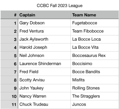 Join us for summer Open Play Bocce sponsored by CCBC in July and August. All members are welcome. Tuesday and Wednesday Mornings 10AM-Noon. Meet on courts 3 and 4.