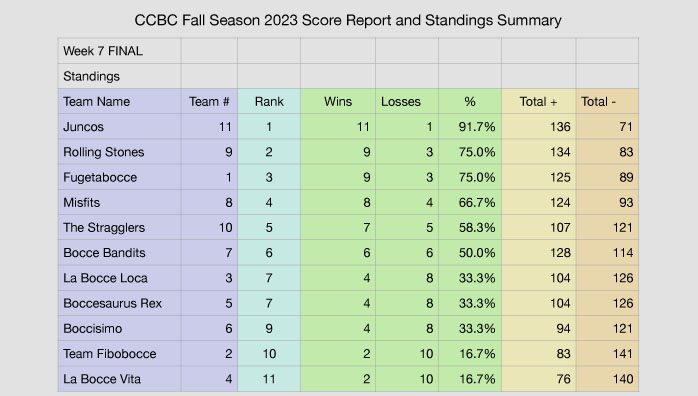Captains Responsibility: At the end of your match the bocce captains should text to (805) 709-2281 the scores for the match. The information needed is the Team ID#, and then for each game, the number of points the team scored (+) and the number of points scored against the team (-). Use a simple format: