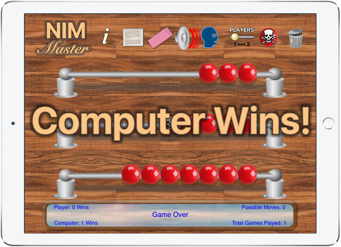NIM Master presents a classic strategy game where the object is to force the other player to make the last move.