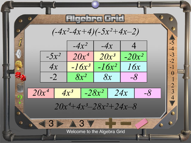 Algebra Grid is designed to provide help in mastering the essentials of algebra, with a special focus on the intricacies of polynomial multiplication. Dive into an engaging and interactive learning environment that simplifies algebraic concepts, allowing you to seamlessly learn and practice.