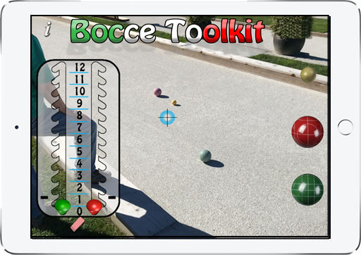 Enjoy playing bocce? Enhance your enjoyment using the Bocce Toolkit AR. It is often difficult to judge which of two balls are closer to the pallino. Using the Bocce Toolkit all you need to do is point the target on your iPhone or iPad screen at the pallino, then move the target to either a red ball or a green ball and tap the appropriate ball icon on the screen. Instantly the app concludes which ball is closer and marks it with a highlight. If sounds effects are turned on the closer ball will be announced.