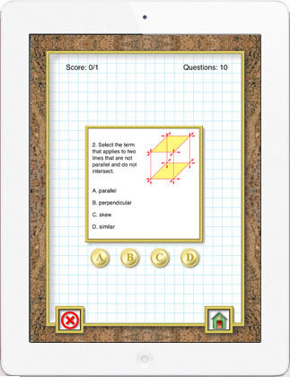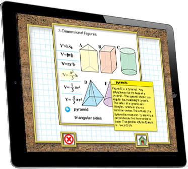 Tap areas of the screen to access information about geometric shapes and figures. Learn the terminology that is important to success in geometry. Geometry Concepts puts the student in control of the pace and scope of the learning experience.