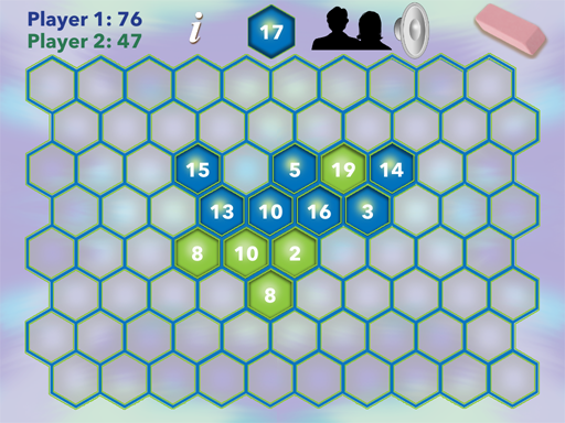 Rules: If a hexagon with a larger value is moved adjacent to the opponent’s piece, the position and points are captured. If a hexagon piece is moved adjacent to any of the same player’s pieces, the pieces increase in value.