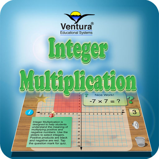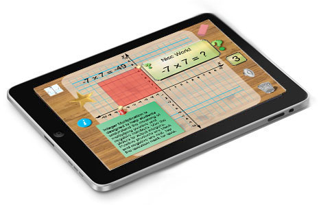 Use the gold sliders on the x and y axes to set the two numbers to be multiplied. Positive products are shown with a black rectangle and negative products are shown in red. Tap the question mark to begin a quiz. The app automatically tracks the number of correct answers. Students are motivated by the sound effects and visually appealing display.