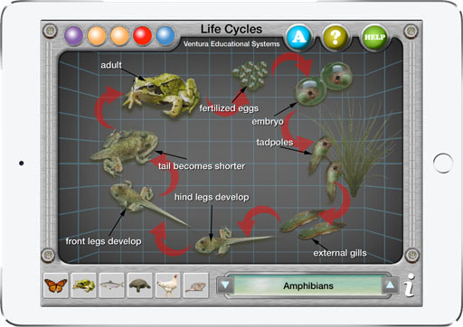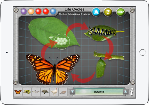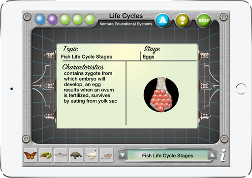 Tap the info button to read interesting facts about each important each topic. Teachers will really like this app. After students have read about a particular life cycle, they can tap the quiz button to measure their reading comprehension. In addition to the quiz there is also a word game that helps students review the information presented.