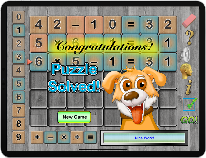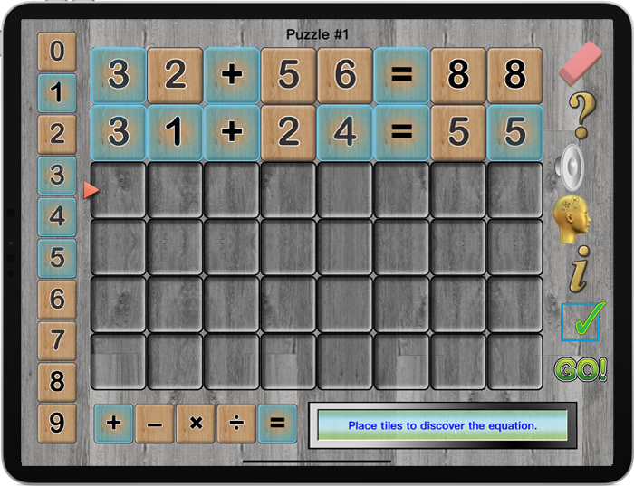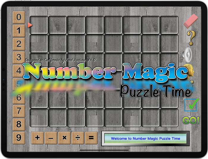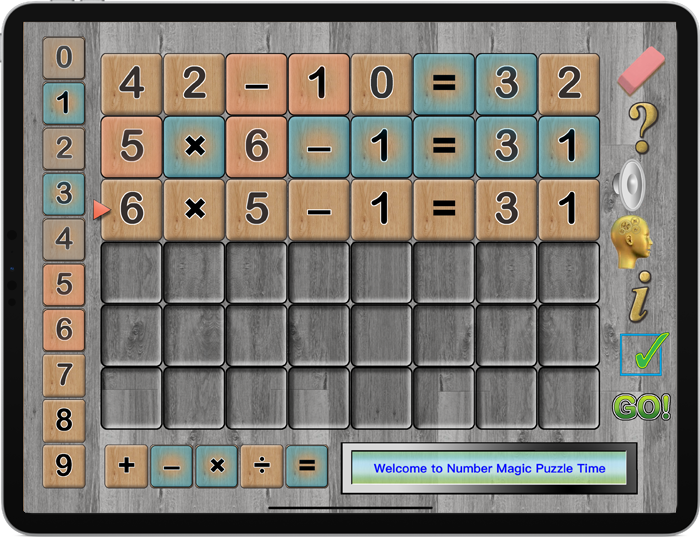 The object of Number Magic Puzzle Time is to use deductive reasoning to find the mystery equation. Begin by placing numbers and operations on the top row. Use the feedback given to figure out the mystery equation. Orange means the number or operation is correct but it is not in the right place. Blue means that the number or operation is correct and it is in the right place. Use logical thinking to determine the mystery equation.