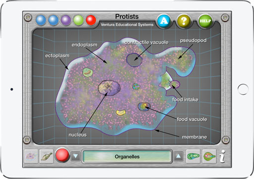 Select the topic that you wish to explore and then hit the power button to zoom off to views of amoeba, euglena, paramecium or plasmodium. Continue tapping buttons to explore even more interesting facts. Each organism is illustrated in detail with descriptions giving even more information.