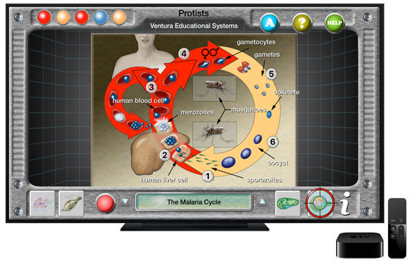 Charts and graphs are used to present cross-sectional views and information about microorganisms including the malaria cycle. Interactive Protist Explorer is available for iOS and tvOS devices. It is just beautiful on a big screen TV and would be a wonderfully exciting tool in any science classroom.
