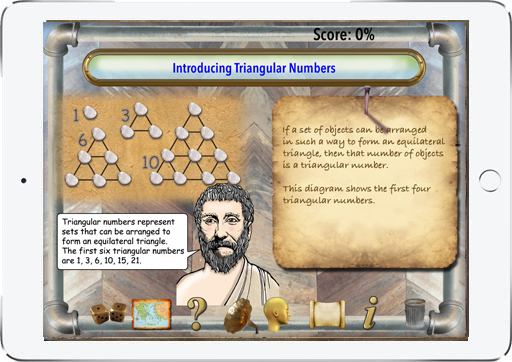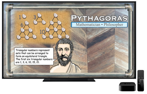 With this app students learn about the lifestyle and philosophy attributed to the Pythagoreans. One of the beliefs that this group held was that numbers had mystical qualities. The group studied patterns and discovered many important relationships. For example, Pythagorean Triples are sets of numbers that can be used to describe the sides of a right triangle as in (3,4,5) or (7,24,25).