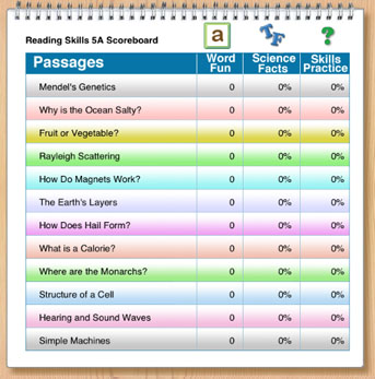 Teachers can use the Scoreboard feature to keep track of student performance as they work their way through all the passages and activities.