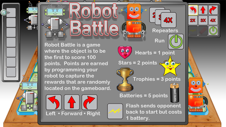 Robot Battle is designed to introduce students to basic programming concepts. Students select the steps that their robot will move and then 'run' their program. The goal is to capture the rewards that are randomly located on the game board.