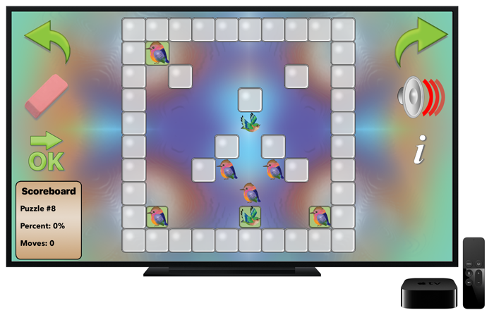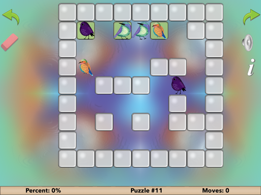 Slip Sliders is for those who like a challenging visual puzzle. The object is to slide icons in the proper sequence and in the proper direction to match up similar birds. Each puzzle consists of walls and open spaces. Icons with birds are located on the puzzle surface. Some icons are 'sliders' and can be moved and others are fixed.