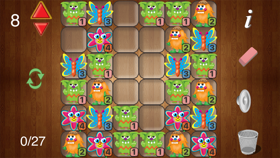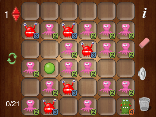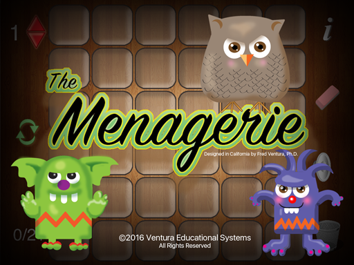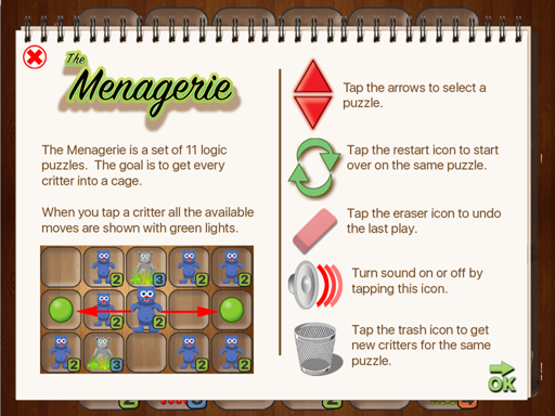 The Menagerie is a set of 11 logic puzzles. The goal is to get every critter into a cage. When you tap a critter all the available moves are shown with green lights. Critters can only be moved once and the number of spaces that each can be moved is indicated. The critters in each puzzle are randomly picked so each puzzle provides a unique experience. Enjoy hours of fun solving these challenging puzzles.